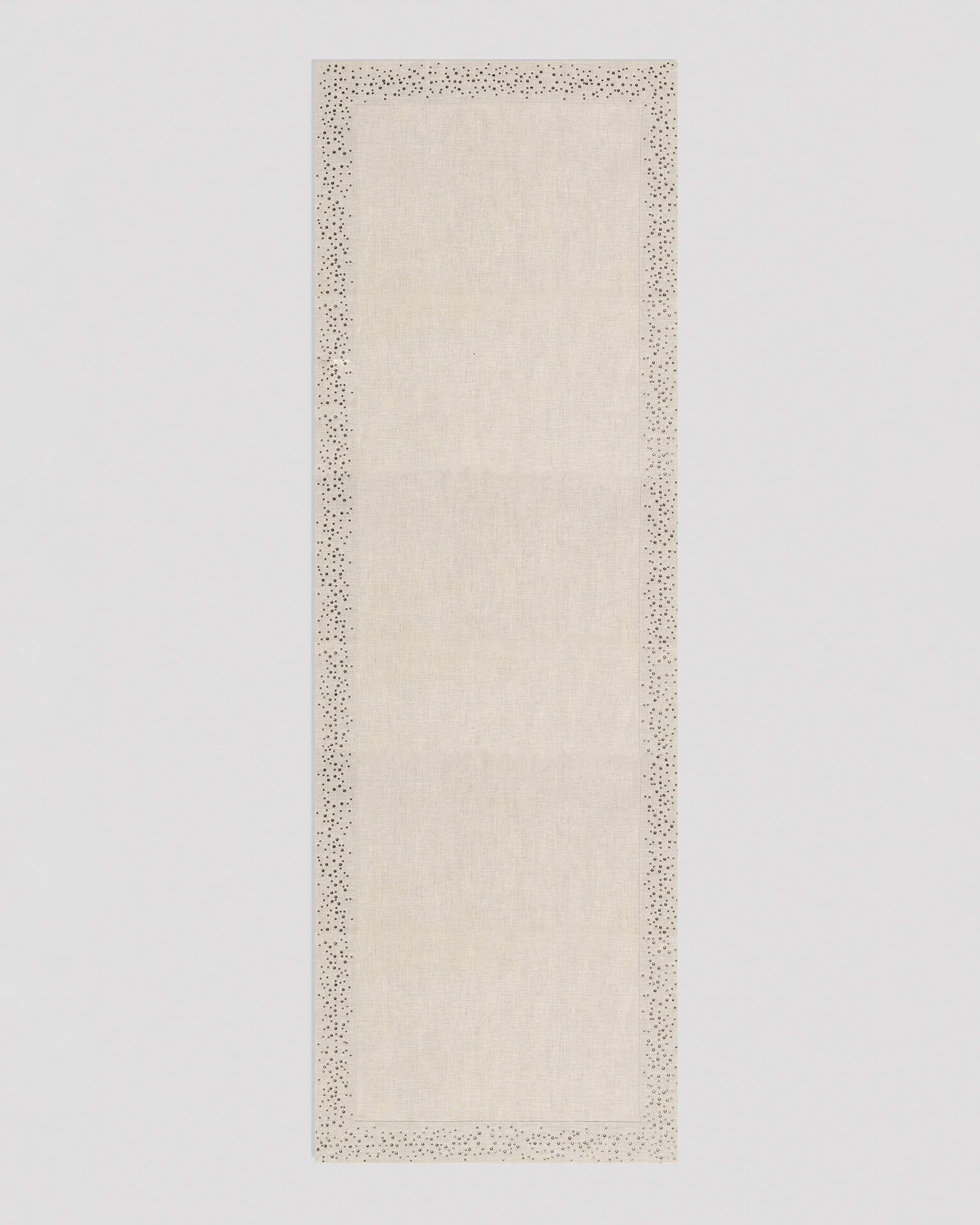 Per ripristinare la naturale rigidità del lino, suggeriamo di sciogliere mezzo cucchiaino di amido nell’acqua dello spruzzino, ottenendo una mano elegante e strutturata. Le macchie più ostinate possono essere trattate esclusivamente sul tessuto – mai sulle pietre – applicando alcune gocce di candeggina su tessuto già bagnato, insieme a sapone di Marsiglia. Una volta rimossa la macchia, risciacquare con cura per preservare la purezza delle fibre.