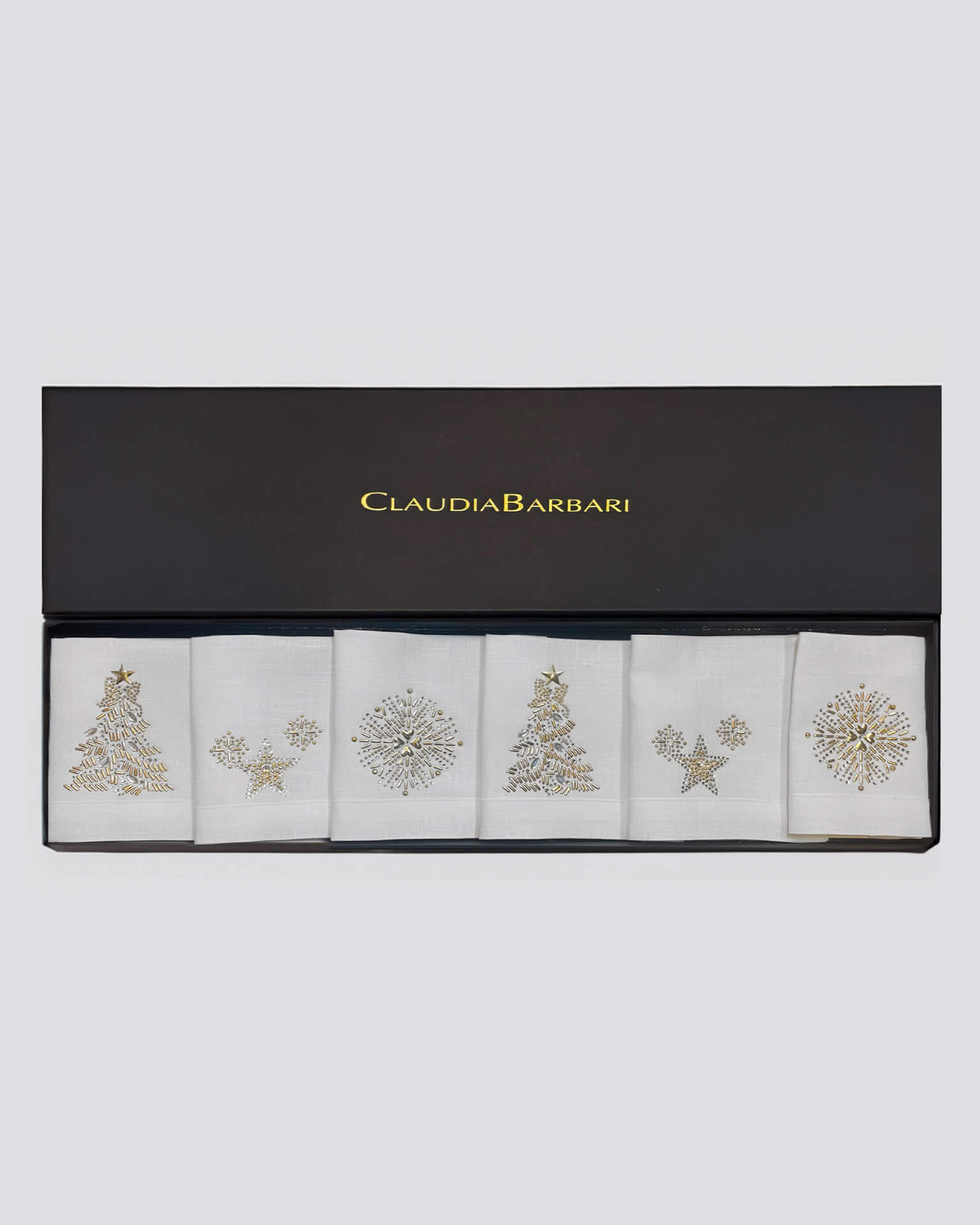 Una collezione esclusiva in puro lino pregiato, composta da tovagliolini da cocktail, tovagliette e tovaglioli da tavola impreziositi da cristalli e dettagli metallici a tema natalizio. Lavabili in lavatrice, uniscono praticità e splendore, diventando il regalo perfetto per sé o per chi ama celebrare le feste con eleganza.